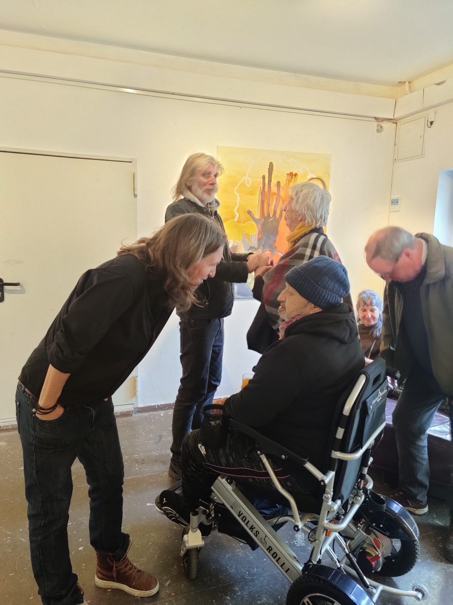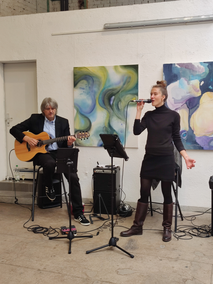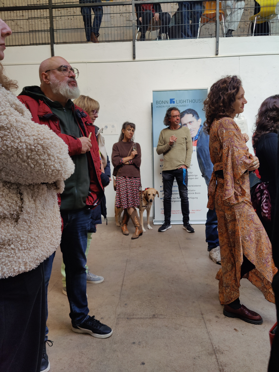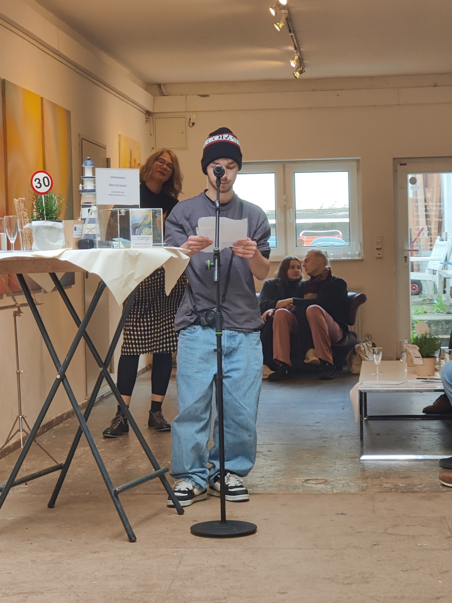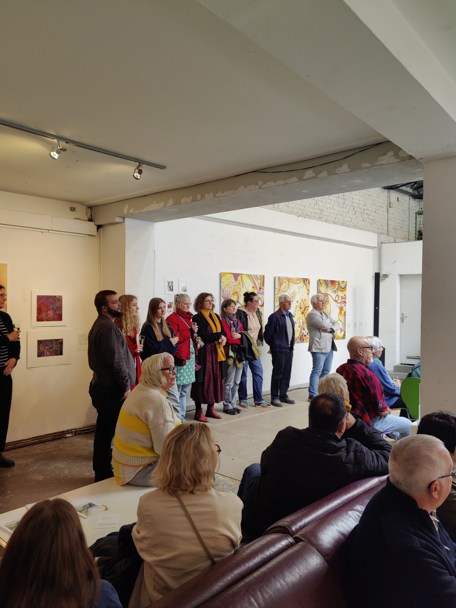 Der Abend stand im Zeichen von Gemeinschaft, Kreativität und Engagement. Neben einer Lesung von Wolf Küper aus seinem noch unveröffentlichten Buch und eindrucksvoller Musik von Igor und Lisa Lazarev beeindruckte besonders die Ausstellung, die in Kooperation mit der Alanus Hochschule für Kunst und Gesellschaft entstanden ist.