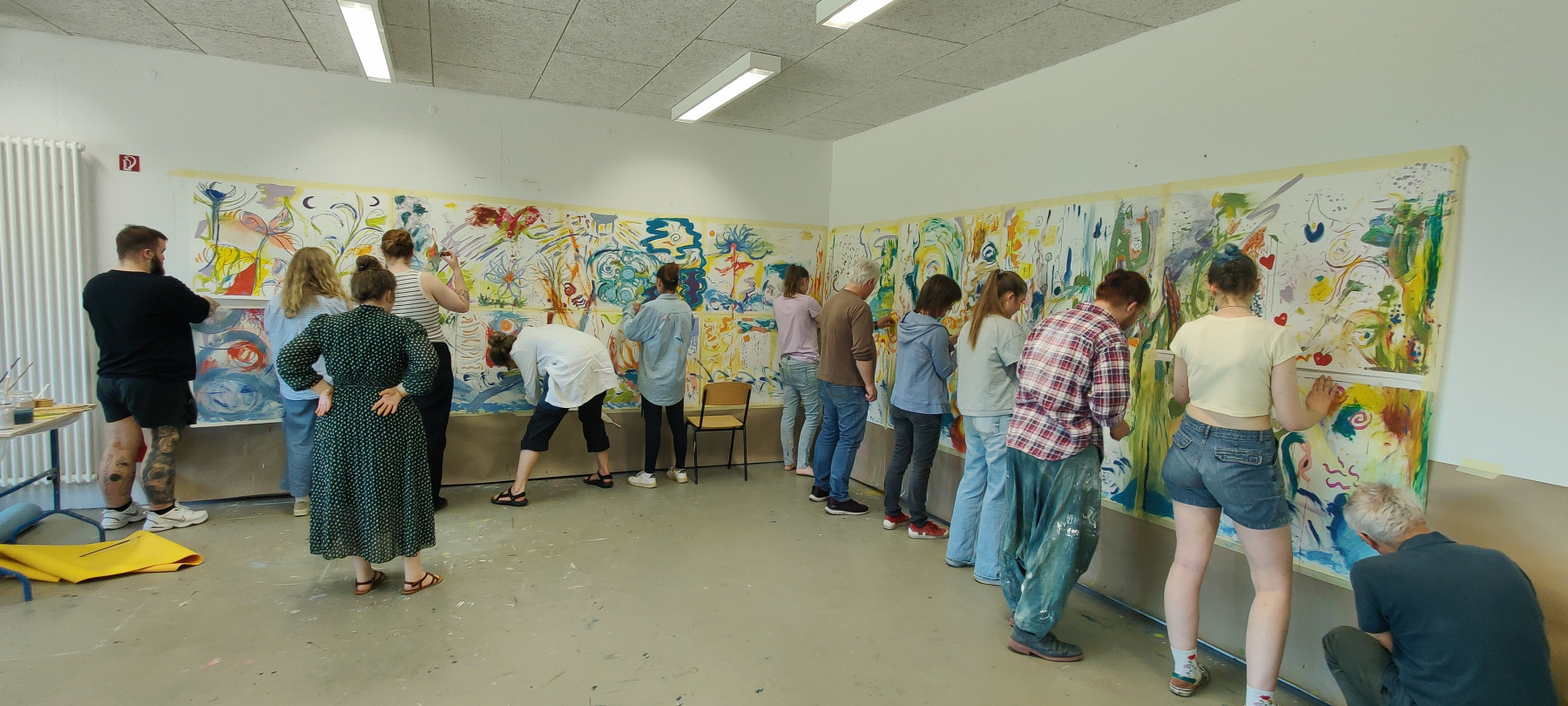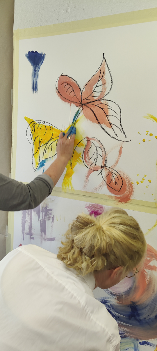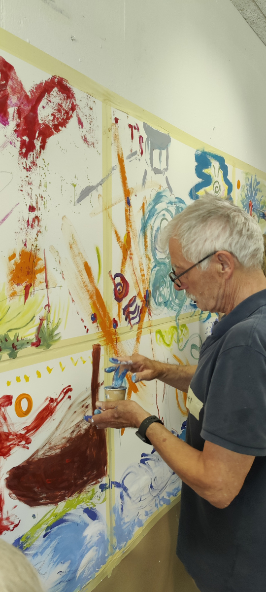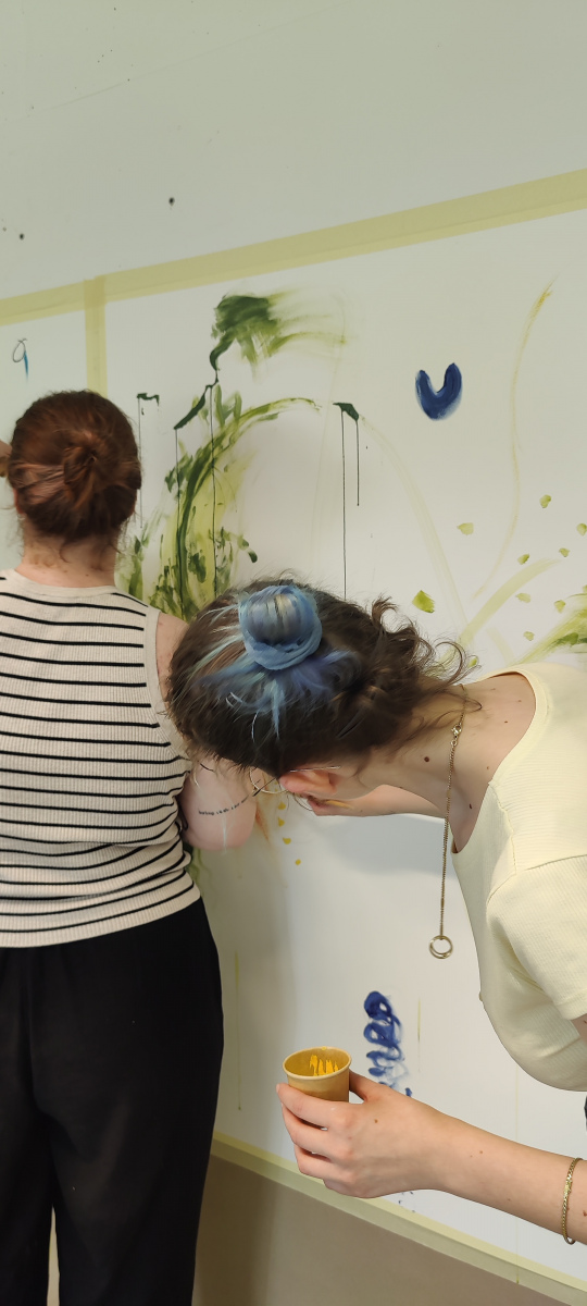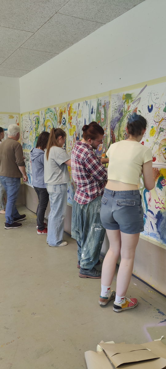 Im Rahmen eines gemeinsamen Projekttages im Mai 2025, mit ehrenamtlichen Mitarbeitenden von Bonn Lighthouse, entwickelten Studierende die Grundideen einer Malperformance. Aus diesen Begegnungen entstanden im Laufe des Semesters individuelle Werke, in denen Linien und Flächen zu Sinnbildern für Wandel, Stille und innere Bewegung wurden.